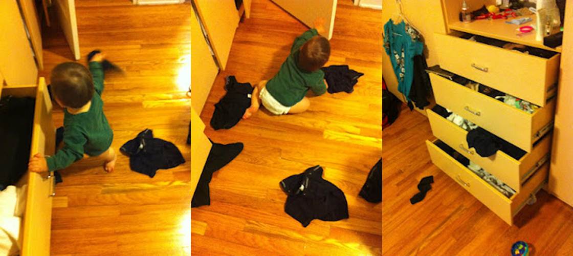 | Other fun Sammy hobbies include going into all of our drawers and throwing my underwear and socks all over the floor, then crawling away. We really need some baby proofing stuff. |